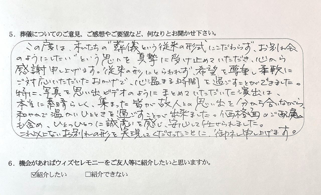この度は、私たちの「葬儀という従来の形式にこだわらず、お別れ会のようにしたい」という思いを真摯に受け止めていただき、心から感謝申し上げます。従来の形にとらわれず、希望を尊重し柔軟にご対応いただいたおかげで、心温まる時間を過ごすことができました。
